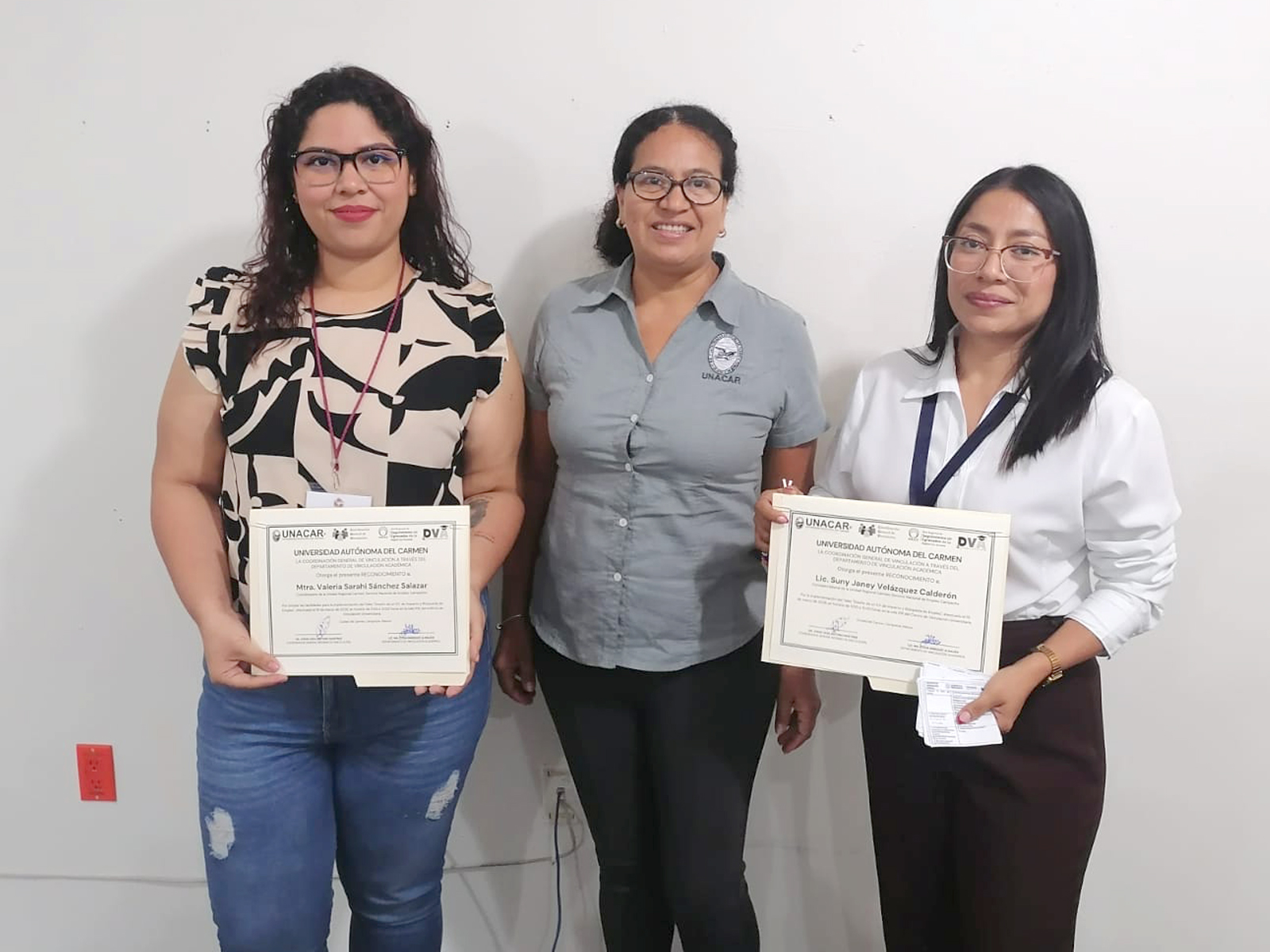 Al cierre de la actividad formativa, la Mtra. Zenaida Rodríguez Córdova, gestora del programa educativo en Lengua Inglesa entregó reconocimientos, en agradecimiento por su participación, a la Lic. Suny Velázquez Calderón y a Mtra. Valeria Sánchez Salazar, consejera laboral y coordinadora de la Unidad Regional Carmen SNE Campeche, respectivamente. La sede del taller fue la sala 106 del edificio de Vinculación Universitaria.