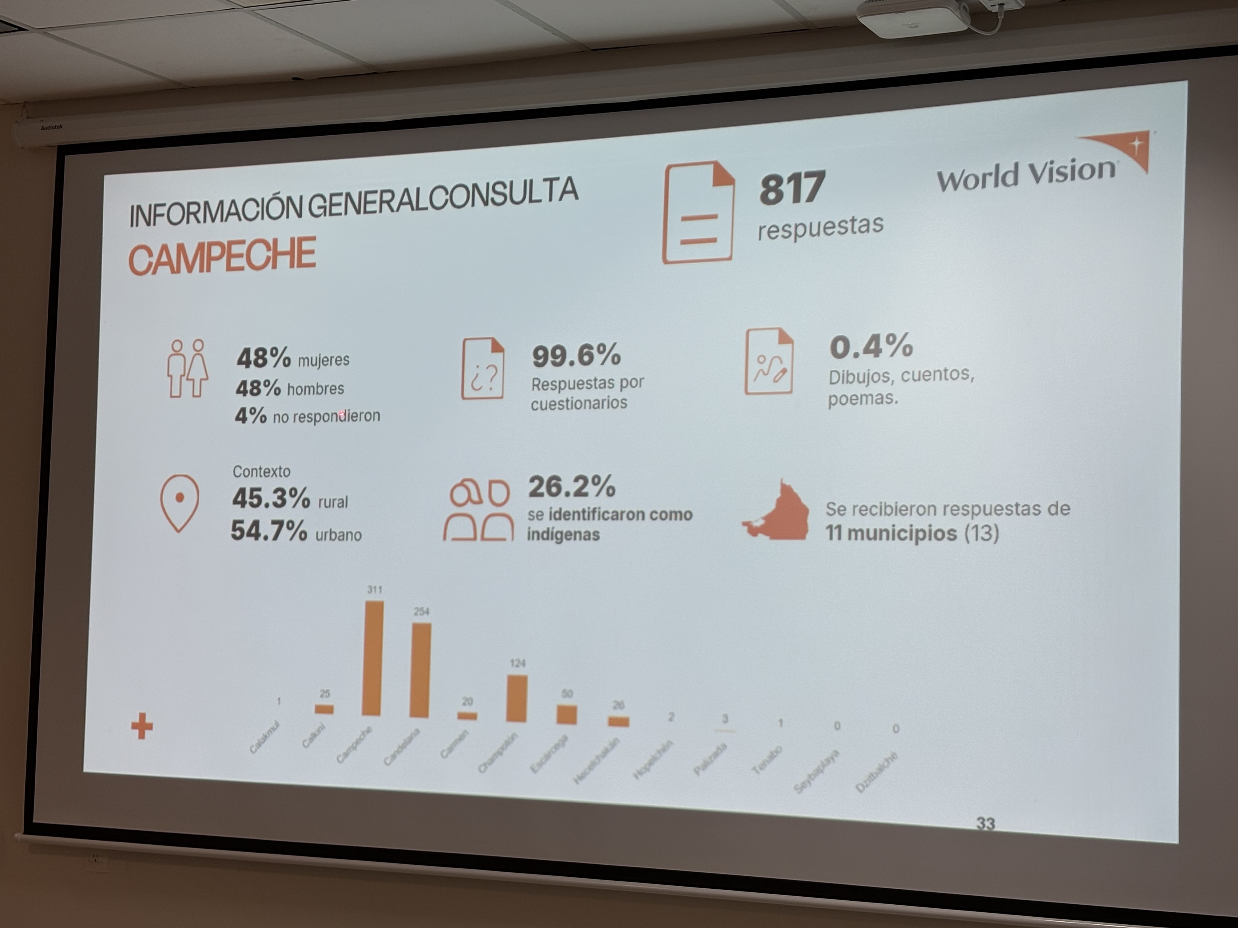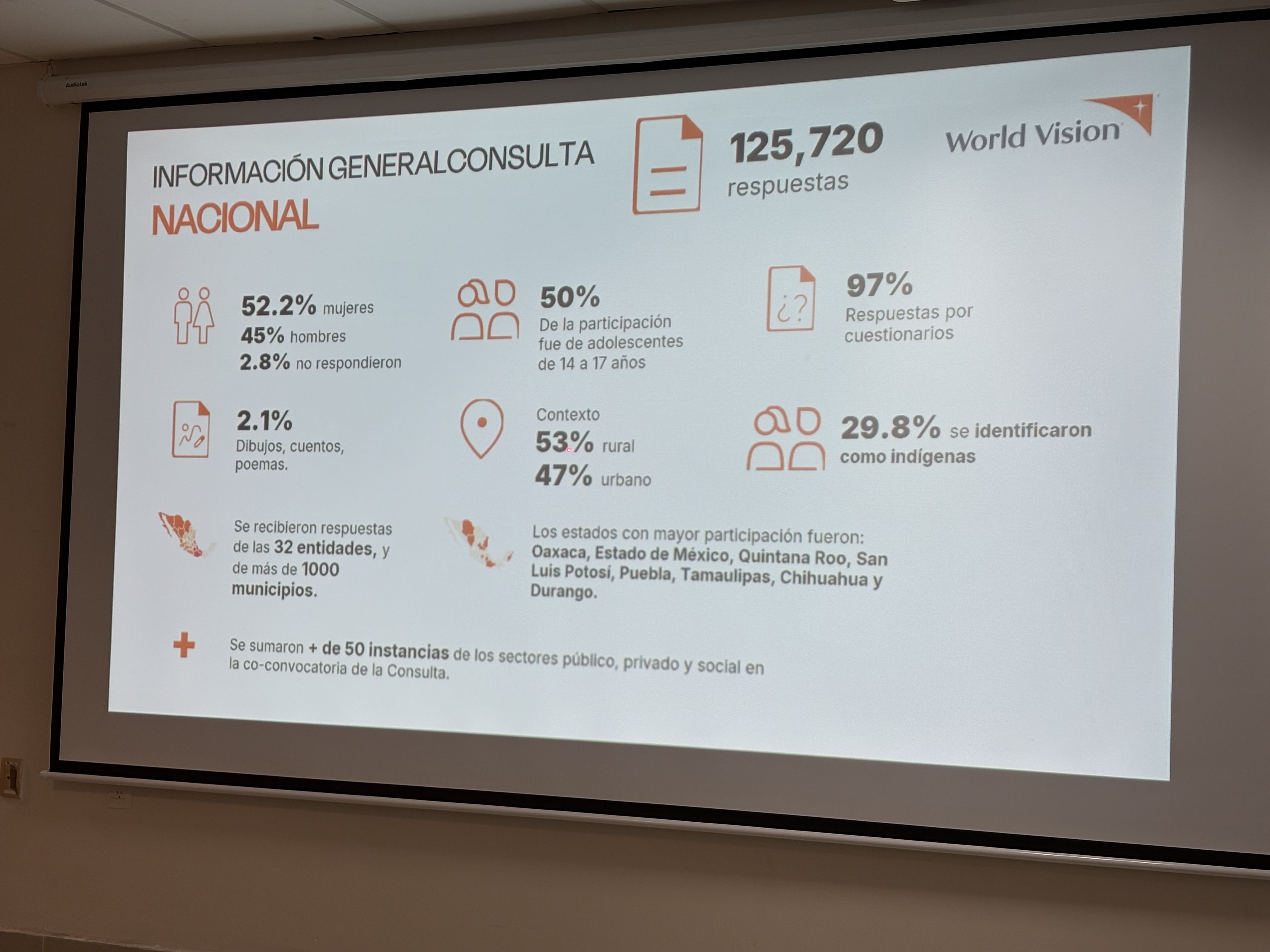 El Lic. Luis Aranda Escobar, oficial de Política Pública Territorial región Sureste de World Visión México, compartió el contexto de la consulta y señaló que más de la mitad de las niñas, niños y adolescentes se encuentran en situación de pobreza. La población indígena es la más impactada, además de registrar las mayores tasas de desnutrición en comparación con el resto de la población, datos que citó del Consejo Nacional de Evaluación de la Política de Desarrollo Social (CONEVAL) de 2022.
